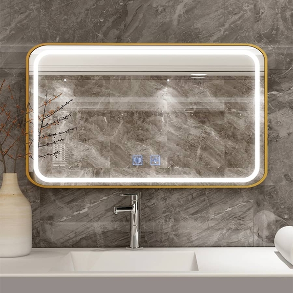 Gương khung inox mạ vàng tích hợp thêm đèn LED cảm ứng - là loại gương có thiết kế nút cảm ứng hiển thị trên mặt gương, bạn chỉ cần chạm nhẹ để bật tắt đèn led.